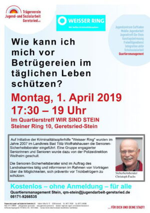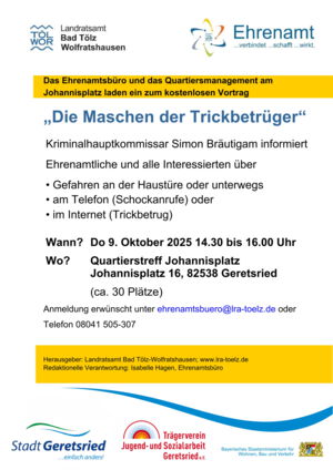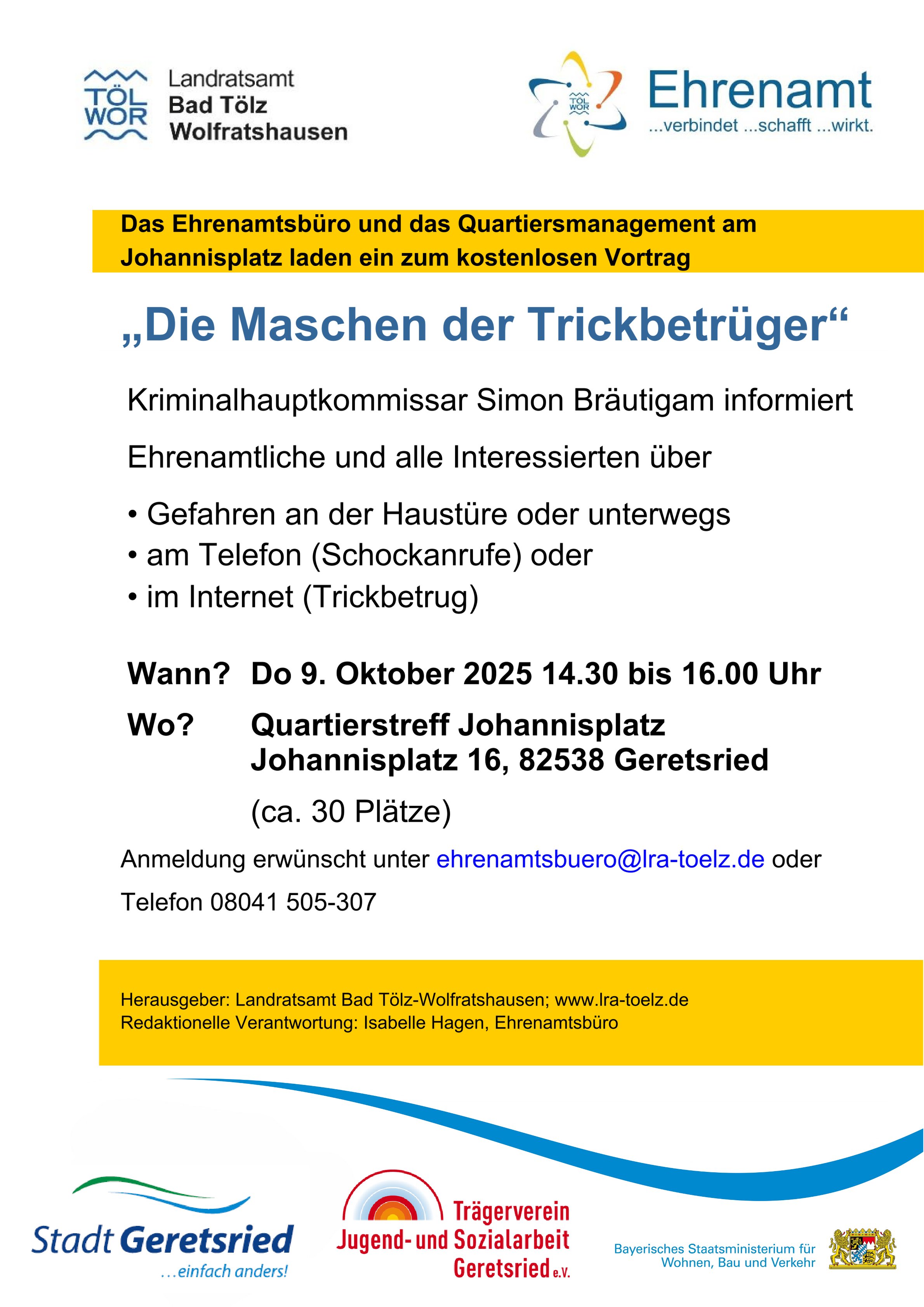 Der Trägerverein Jugend- und Sozialarbeit Geretsried e.V. lädt gemeinsam mit dem Ehrenamtsbüro des Landkreises Bad Tölz-Wolfratshausen zum Vortrag von Kriminalhauptkommissar Simon Bräutigam zum Thema „Die Machen der Trickbetrüger“ ein.
