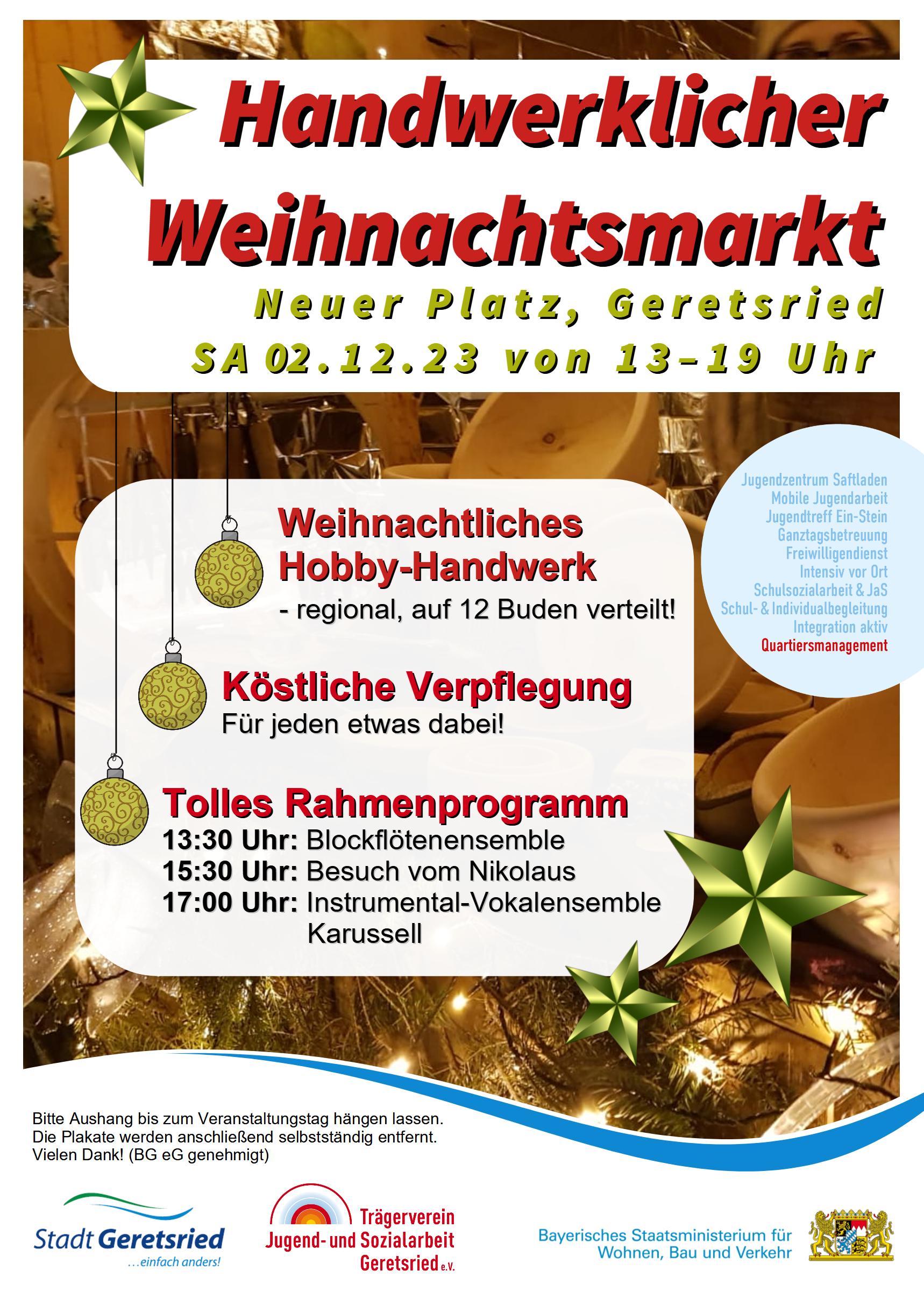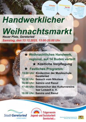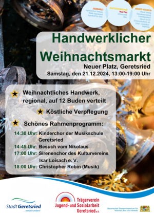 Am Samstag, den 21. Dezember 2024, laden wir Sie herzlich ein, einen festlichen Tag auf dem Neuen Platz in Geretsried zu verbringen. Von 13:00 bis 19:00 Uhr erwartet Sie ein abwechslungsreiches Programm voller regionaler Handwerkskunst, kulinarischer Köstlichkeiten und stimmungsvoller Musik.