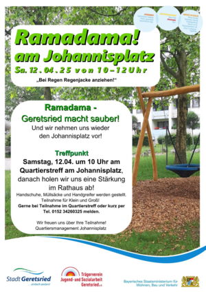 Am Samstag, den 12. April 2025, findet erneut die bundesweite Aktion „Ramadama“ statt. Diesmal ist auch der Neue Platz dabei! Treffpunkt ist um 10:00 Uhr am Brunnen, von wo aus wir ausgerüstet mit Müllsäcken, Handschuhen und Greifzangen, die vor Ort zur Verfügung gestellt werden, gemeinsam loslegen. Nach getaner Arbeit erwartet alle fleißigen Helfer eine kleine Stärkung im Rathaus.