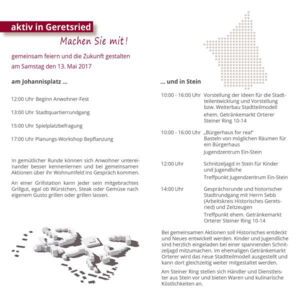 Wir starten den Tag um 11.00 Uhr am Quartierstreff Stein mit einem „Tag der Offenen Tür des Quartierstreffs“ und geselligem Beisammensein. Weiter gehts dann um 12 Uhr zum Maifest am Neuen Platz. Es gibt Gegrilltes und Maibock, sowie ein buntes Unterhaltungsprogramm bis 18 Uhr. Den Abschluss bildet ab 14 Uhr der Johannisplatz mit einem „Tag der Offenen Tür von Pfarrgemeinde und Bürgerbüro“, an dem sich alle aktiven Gruppierungen vorstellen und Aktionen anbieten.