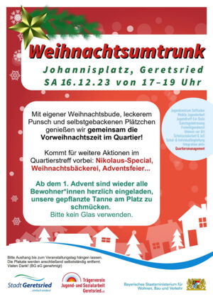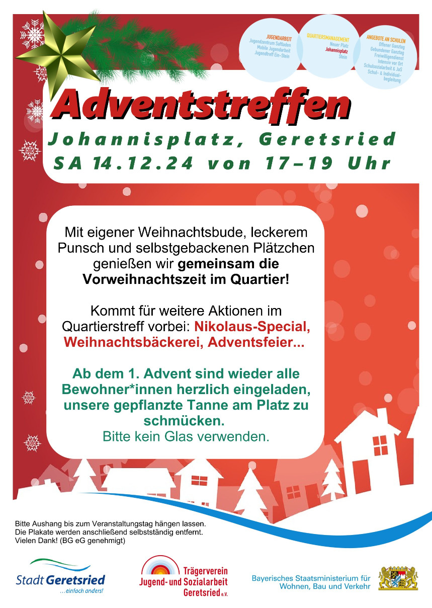 Am Samstag findet wieder unser alljährliches Adventstreffen am Johannisplatz statt! Ab 17 Uhr gibt es in unserer Weihnachtsbude vor dem Quartierstreff Punsch, Plätzchen und gute Stimmung.