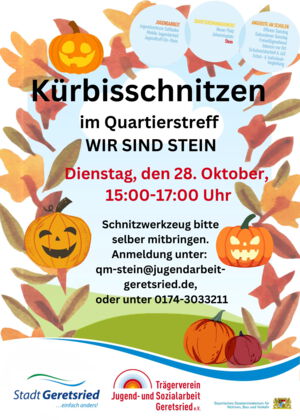 🎃 Beim Kürbis-Schnitzen im Quartierstreff WIR SIND STEIN wird’s herbstlich und kreativ! Ob klein oder groß – alle sind herzlich eingeladen, gemeinsam tolle Kürbisgesichter zu schnitzen und in gemütlicher Atmosphäre den Herbst zu feiern. 🍂✨ Bitte bringt euer eigenes Schnitzwerkzeug mit, die Kürbisse werden gestellt.