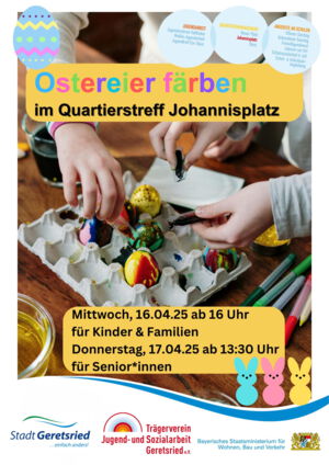 In der Woche vor Ostern unterstützen wir den Osterhasen wieder fleißig! Kinder und Erwachsene sind zum gemeinsamen Ostereier färben in den Quartierstreff am Johannisplatz eingeladen.