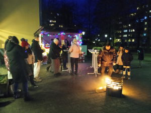 Am Samstag, den 14. Dezember 2024, fand die Weihnachtsfeier am Jugendtreff Ein-Stein statt. Veranstaltet wurde sie gemeinsam vom Jugendtreff Ein-Stein und dem Quartiersmanagement Stein. Trotz Regen herrschte eine gemütliche Atmosphäre. Vier festlich geschmückte Buden boten Handwerk, Waffeln, Glühwein, Punsch und weitere kulinarische Köstlichkeiten an. Ehrenamtliche Helfer sorgten für einen reibungslosen Ablauf. Der junge Sänger Luka untermalte das Fest mit Weihnachtsliedern, später sang eine Anwohnerin aus dem Quartier Stein. Eine knisternde Feuerschale lud zum Aufwärmen und Verweilen ein. Ein großer Dank an alle Beteiligten für diesen gelungenen Abend voller Gemeinschaft und festlicher Stimmung!