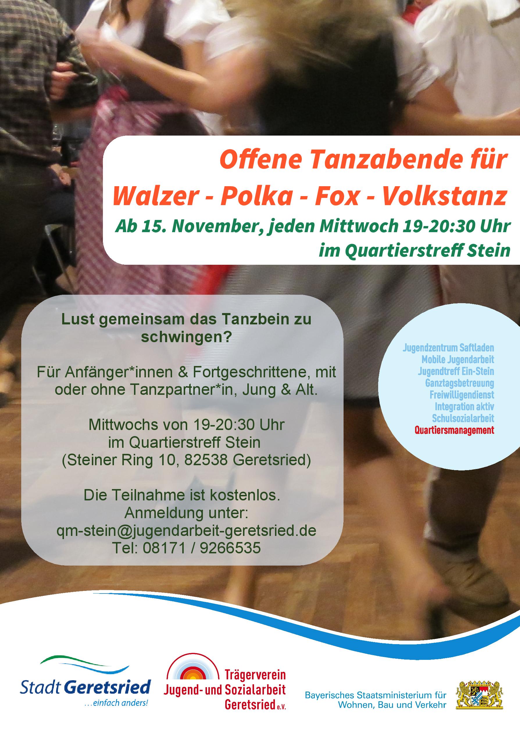 Die Offenen Tanzabende gehen in die nächste Runde! Christine und Georg Hodolitsch laden alle Tanzbegeisterten herzlich ein, jeden Mittwoch im Quartierstreff „WIR SIND STEIN“ das Tanzbein zu schwingen. Ob Walzer oder Polka – hier kommt jeder auf seinen Geschmack. Die Veranstaltungen richten sich an alle Altersgruppen und Erfahrungsstufen: Egal ob jung oder alt, allein oder in Gesellschaft, Anfänger oder Fortgeschrittene – alle sind willkommen!