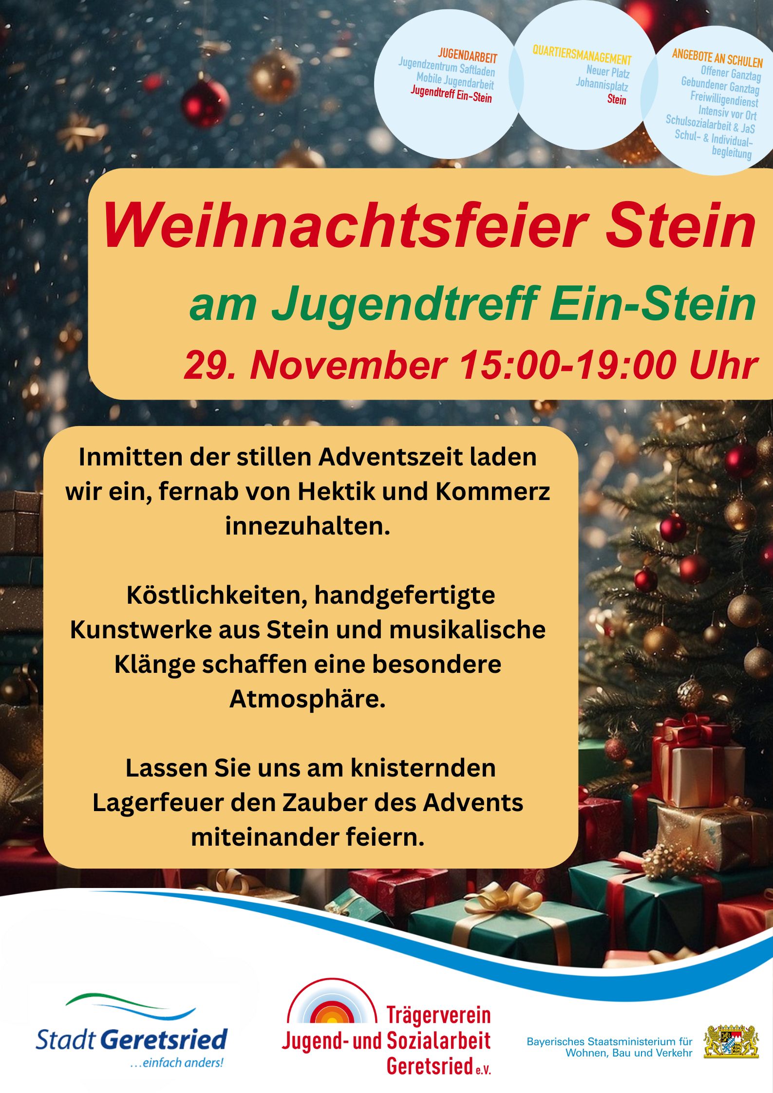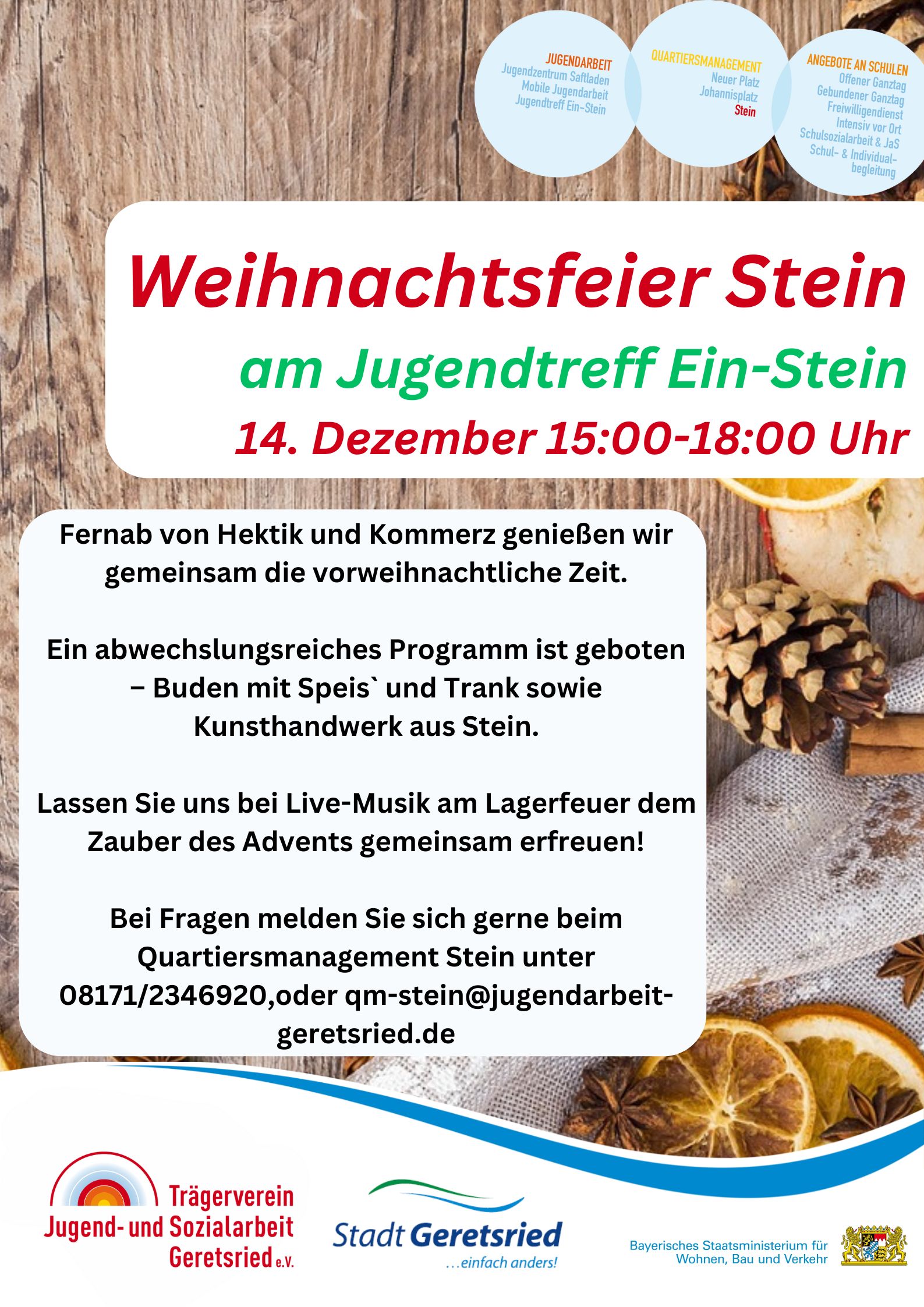 Der südlichste Stadtteil Geretsrieds, Stein, hat zur alljährlichen Weihnachtsfeier am Samstag, den 15. Dezember von 14.00 bis 19.00 Uhr eingeladen.