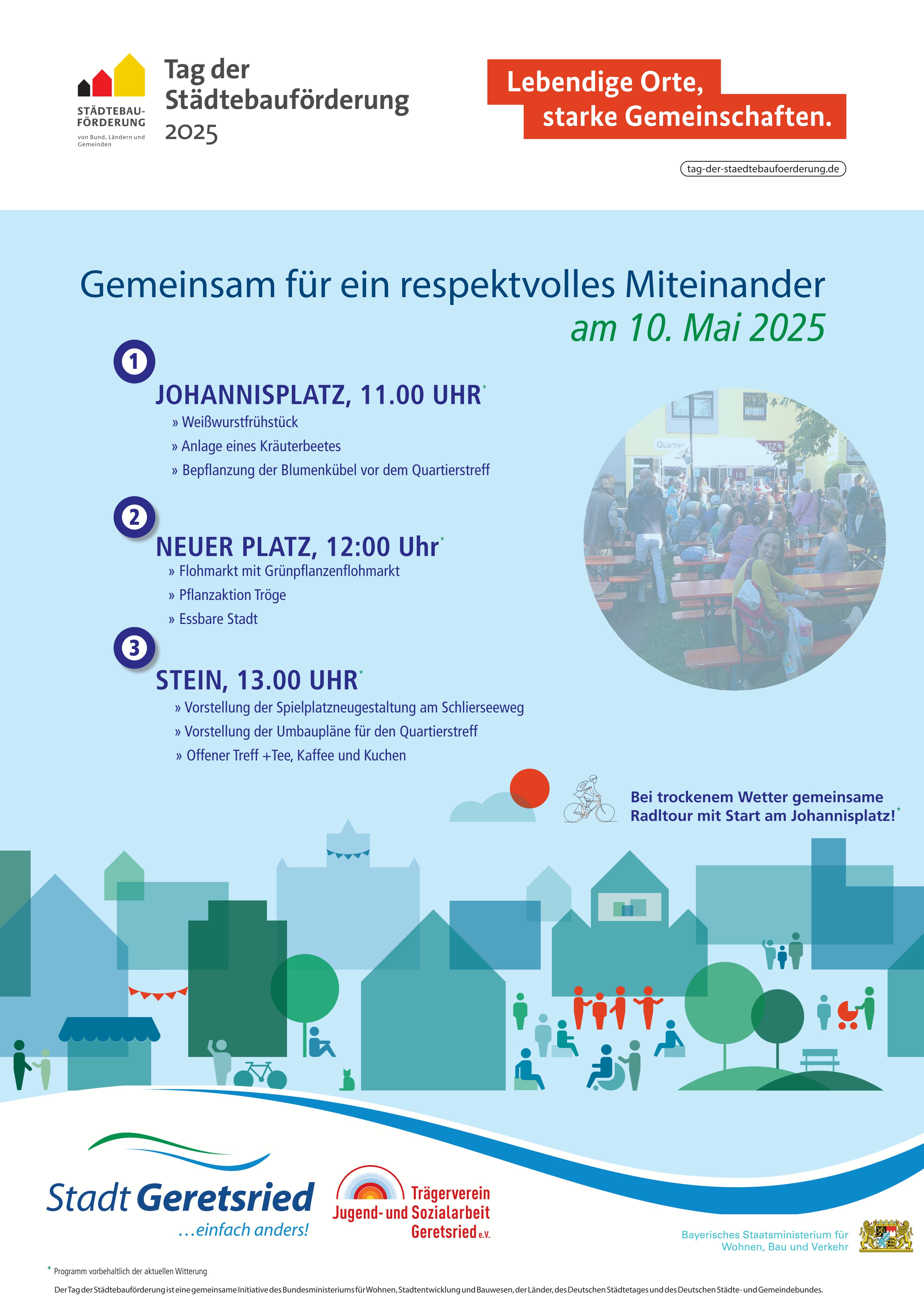 Der diesjährige Tag der Städtebauförderung steht unter dem Motto "Lebendige Orte, starke Gemeinschaften". Der TVJA und die Stadt Geretsried haben in allen drei Sanierungsgebieten ein buntes Programm für diesen Tag zusammengestellt.