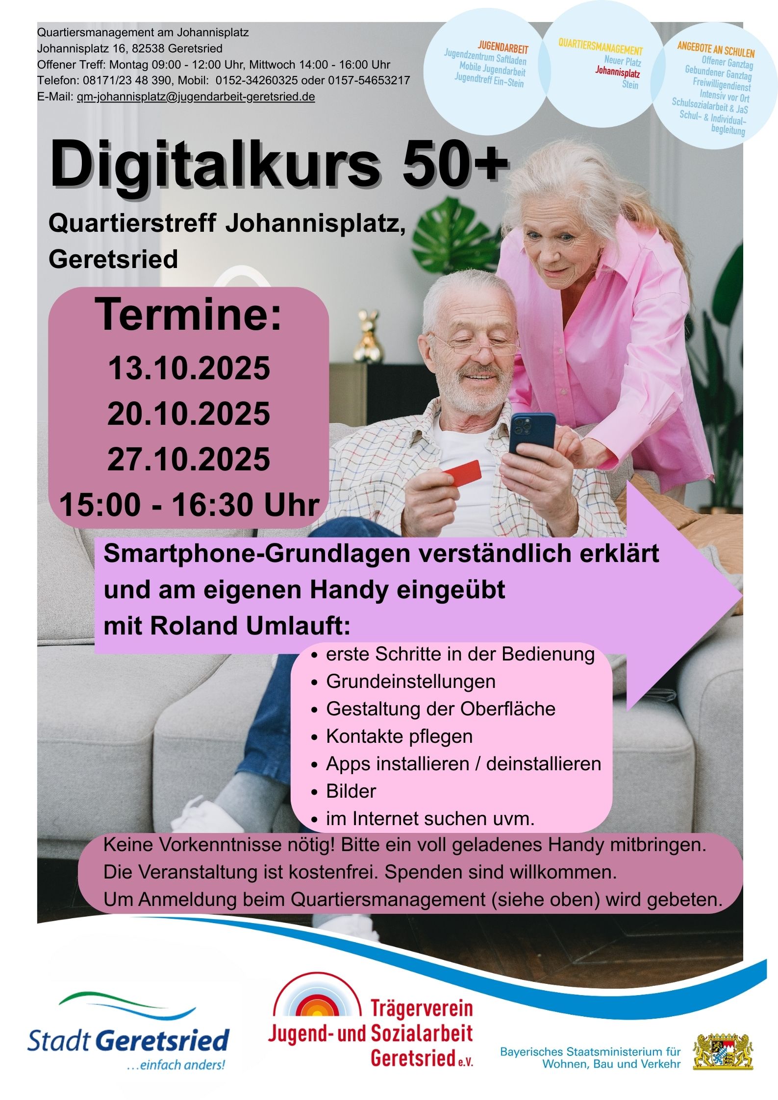 Der Trägerverein Jugend- und Sozialarbeit Geretsried e.V. bietet im Oktober im Quartierstreff am Johannisplatz eine Digitalkursreihe für ältere Menschen an, in der insbesondere Smartphone-Grundlagen verständlich erklärt und am eigenen Handy eingeübt werden können.