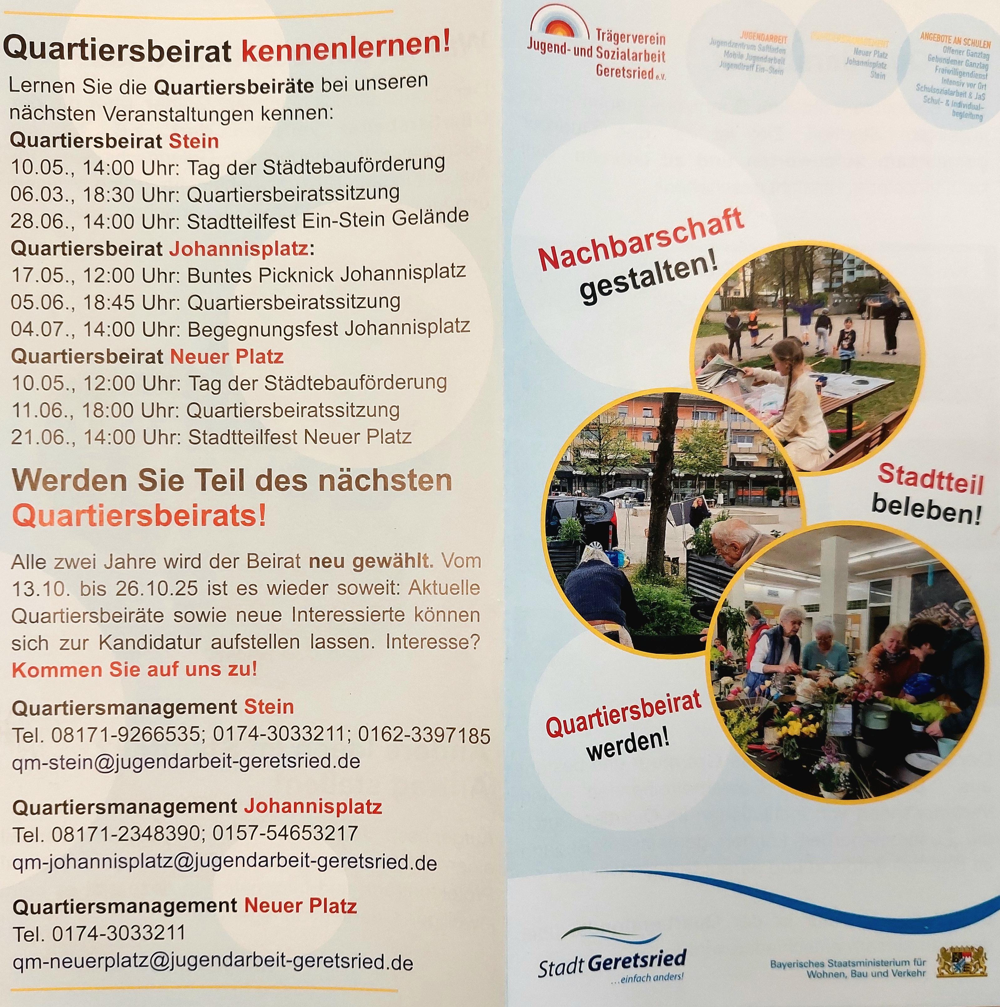 Vom 13.10. – 26.10.2025 werden die Quartiersbeiräte am Johannisplatz, Neuen Platz und in Stein durch die Bewohnerschaft gewählt. Informationen zu den Kandidierenden erhalten Sie beim jeweiligen Quartiersmanagement oder unter www.jugendarbeit-geretsried.de.