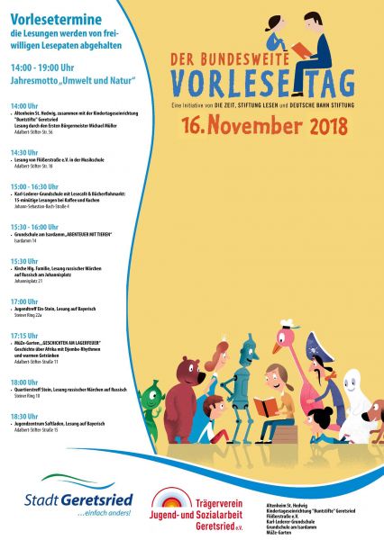 Wir laden Sie herzlich zum diesjährigen Vorlesetag am 16. November von 14-19 Uhr ein - dieses Jahr unter dem Motto "Umwelt und Natur". Eröffnet wird der Vorlesetag von Bürgermeister Müller im Altenheim St. Hedwig. Weitere Infos können Sie dem Plakat entnehmen.