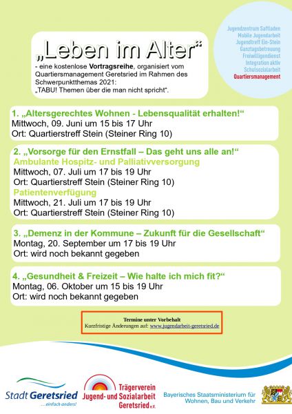 Am Dienstag, den 24. Juni 2025, um 17:00 Uhr lädt der Quartierstreff WIR SIND STEIN zu einem Vortrag über das Thema Patientenverfügung und Vorsorgevollmacht ein. Referent ist Herr Christian Laßwitz vom Christophorus Hospizverein Bad Tölz-Wolfratshausen e.V.