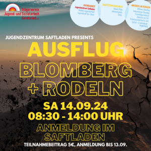 Der Berg ruft! Das Jugendzentrum Saftladen bietet euch einen tollen Ausflug auf den Blomberg! Wenn Ihr nach Brotzeit und besten Ausblick genug habt, dann wird mit der Sommerrodelbahn wieder runtergefahren! Freut euch auf einen tollen Tag an der frischen Luft und genießt die letzten Sommertage!