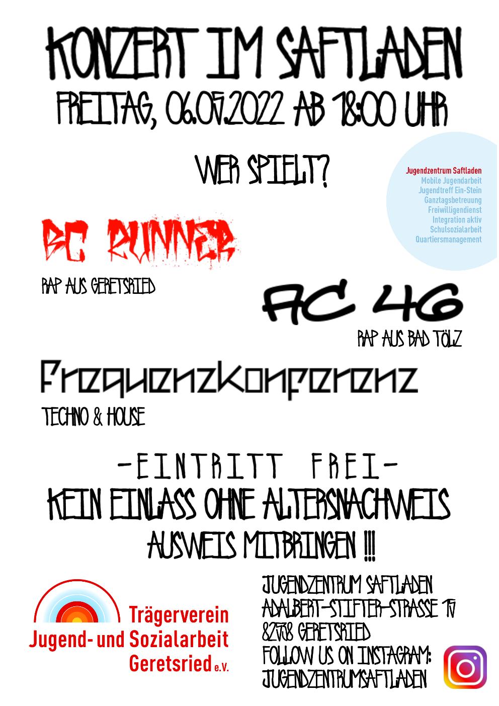 Im Saftladen teilen sich am Freitag, 06. Mai 22 die Rapper BC Runner aus Geretsried und AC 46 aus Bad Tölz die Bühne, anschließend gibt es gepflegten Techno von FrequenzKonferenz auf euer Ohr!