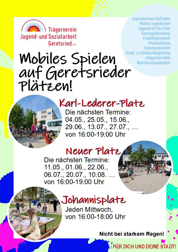 Unser Mobilspielangebot in Geretsried! Wir haben wieder gestartet, mit Spiel und Spaß auf Geretsrieder Plätzen für euch da zu sein! Jetzt muss nur das Wetter auch "mitspielen"! Wir sind jeden Mittwoch am Johannisplatz und jeden Donnerstag im Wechsel am Karl-Lederer-Platz und am Neuen Platz! Im Flyer stehen alle Termine, diesen bekommt Ihr vor Ort! Wir freuen uns auf euch! Nicht bei starkem Regen!