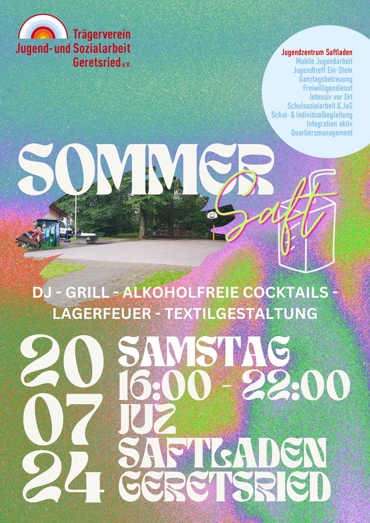 Wir veranstalten am Samstag, den 20.07.24 eine Sommerparty auf dem Basketballplatz am Jugendzentrum Saftladen in Geretsried. Freut euch auf eine chillige Atmosphäre mit elektronischer Live-Musik, leckerem Grill und alkoholfreien Cocktails! Dazu könnt Ihr eure eigenen Saftladen-Bags gestalten! Lasst euch überraschen. Abschließen tun wir das Ganze mit einem Lagerfeuer und Stockbrot. Um 16:00 Uhr geht’s los, wenn’s regnet sind wir drinnen!