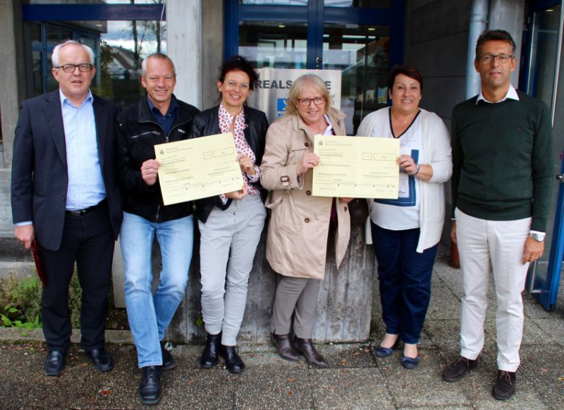 Dr. Thomas Felder (r.) und Wolfgang Fröhlich (l.) überreichen an Vertretrer der staatlichen Realschulen Geretsried und Wolfratshausen sympbolische Schecks. Mit dem Erlös aus der alljährlichen Krapfenaktion des Lions-Club Wolfratshausen-Geretsried wird die Schulsozialarbeit am jeweiligen Schulstandort unterstützt. Christine Venus-Michel (3.v.l.) und Rudi Mühlhans (2.v.l.) freuen sich über die wichtige Hilfe.